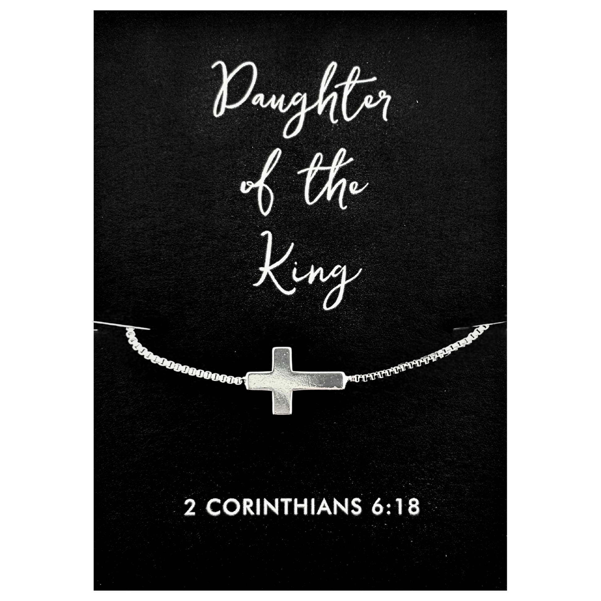 A classic cross necklace presented in inspirational packaging that reads “Daughter of the King – 2 Corinthians 6:18.” A beautiful symbol of faith, love, and divine identity.